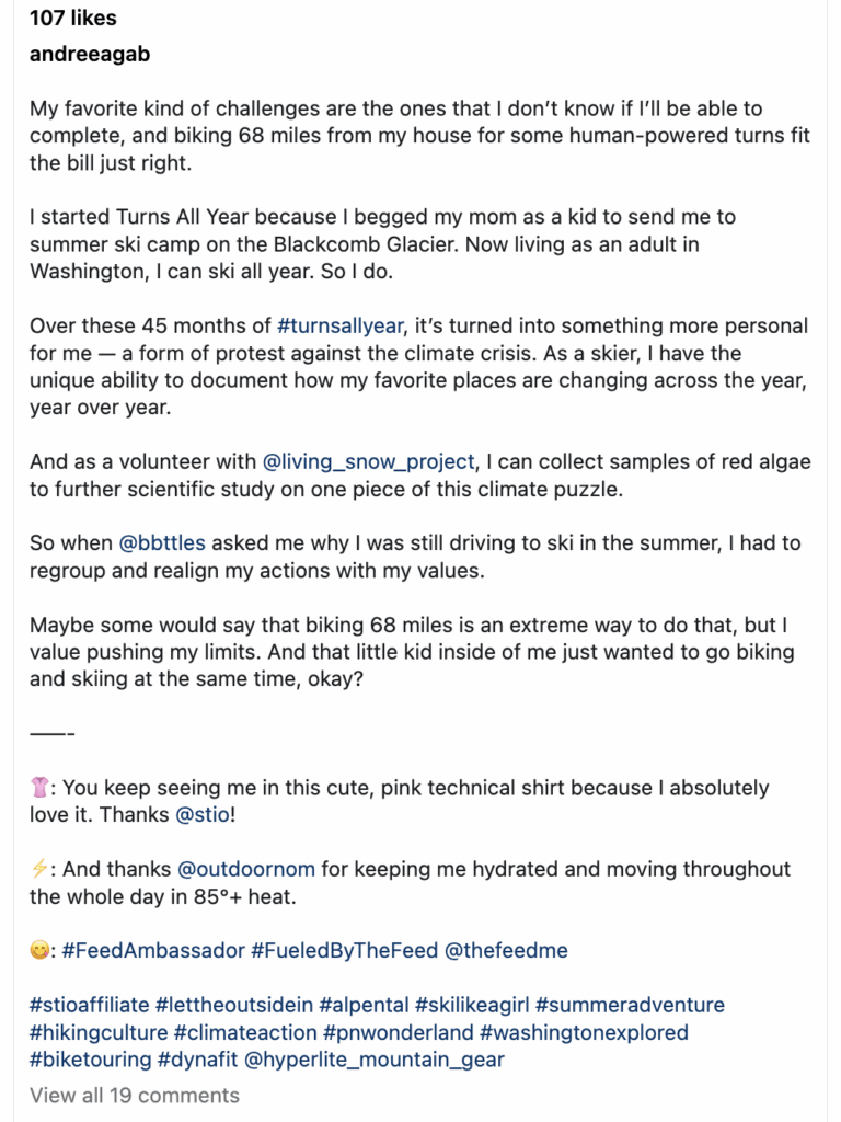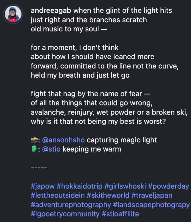 Copywriting: I wrote the copy for my content, integrating themes from Stio's brand brief with topics I'm passionate about writing about: personal growth, mountain adventures, and poetry. I experimented with two different caption formats: short fragments and micropoetry, and longer poems. I tagged Stio with the appropriate brand hashtags and did my own research to select additional relevant hashtags.